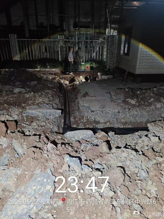 5月22日下午,禁漫 管网运行部接到紧急报修电话,东兴区政府DN150钢管突发爆裂,直接影响东兴区政府、东兴初中、十三小、大渊龙居等区域的居民用水。维修组和探漏组迅速组织人员赶赴现场。确认漏点位置后,维修工作陷入困境,因漏点位于东兴区政府门卫室下方,无法展开维修。分管领导黄勇得知情况后,亲临现场指导,与部门负责人张羽、雷鸣商讨后制定了改管方案,并现场指挥维修工作有序进行。