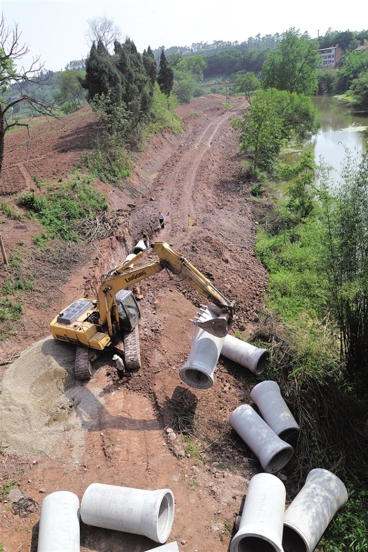 日前,记者来到位于东兴区新江街道办事处清流村(沱江、清流河、小青龙河交汇处),看到不少工人在工地上忙碌,有的开着挖机平场地,有的在挖沟槽埋管网,有的在用货车运输土方,好不热闹。