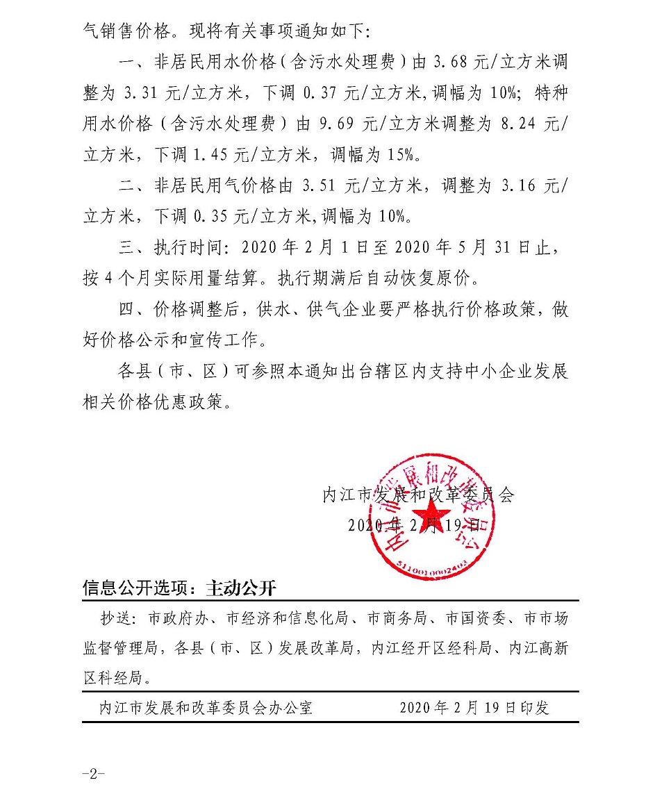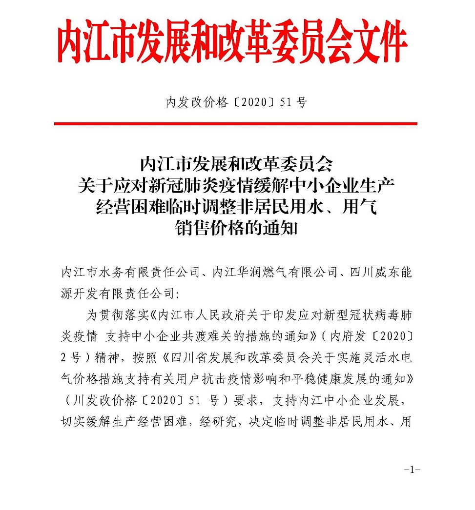 内江市发展和改革委员会关于应对新冠肺炎疫情缓解中小企业生产经营困难临时调整非居民用水、用气销售价格的通知