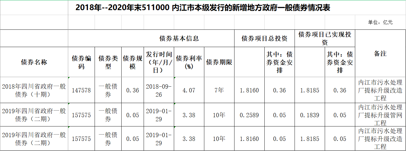 2018年-2020年末511000内江市本级发行的新增地方政府一般债券情况表
