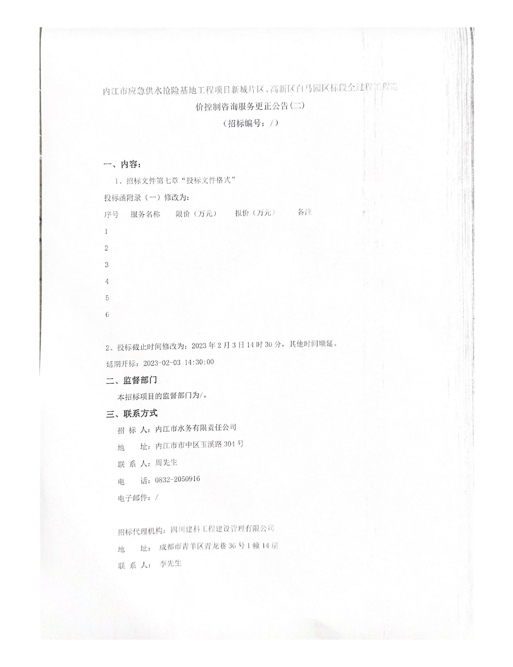 内江市应急供水抢险基地工程项目新城片区、高新区白马园区标段全过程工程造价控制咨询服务更正公告(二)