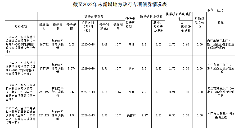 内江市本级截至2022年末新增地方政府债券存续期信息公开(水务)