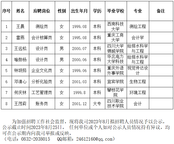 禁漫 2023年8月拟招聘人员公示