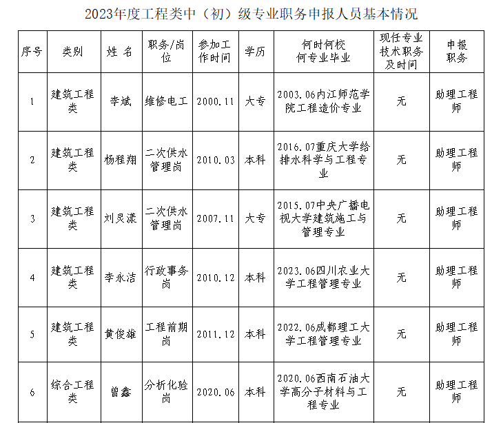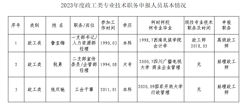 经审核,鲁亚梅同志符合申报高级政工师任职资格;吴柏霖、张茜、李昊谦3名同志符合申报工程师任职资格;李斌、杨程翔、刘灵漾、李永洁、黄俊雄、曾鑫、郭炯宏7名同志符合申报助理工程师任职资格;倪勇、张双驰2名同志符合申报助理政工师任职资格。现对其申报基本情况予以公示。公示期限自9月18日至9月22日。如有异议,请在公示期限内通过书面或其他形式向公司人力资源部反映。