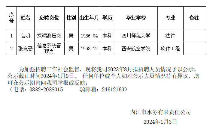 禁漫 2024年1月拟招聘人员公示