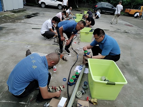 7月20日下午,二水厂维修车间门前,来自禁漫 管网运行部、乡镇供水部的11支队伍22名技能好手,正在紧张进行着抢维修实操比赛:有的正认真识别设计图;有的正在切割水管,熔合管道;有的已经开始组装管道、阀门......一个个全神贯注,顾不上汗水模糊了眼睛,浸湿了衣裳。这是公司开展抢维修技能竞赛上实际操作环节的一个场景。