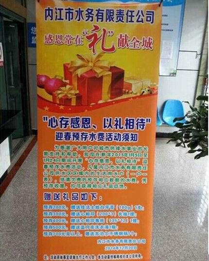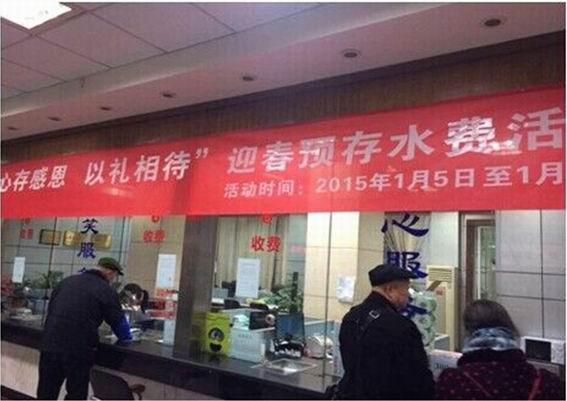 为感谢广大用户对城市供排水事业的长期支持和帮助,我司在2015年1月5日至1月24日期间开展“心存感恩、以礼相待”迎春预存水费活动。本次活动由客户服务部牵头,在白马办事处、物资供应部和机关各部门的支持配合下,圆满结束。