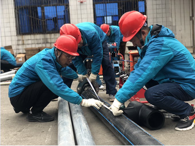 竞赛中,选手们娴熟地分析图纸、按图纸卸料,规范组装和热熔连接。现场三位评委分别对管道安装的管材切割、热熔质量、安装尺寸、整体外观、是否渗漏水等方面进行了测量检查和通水测试。