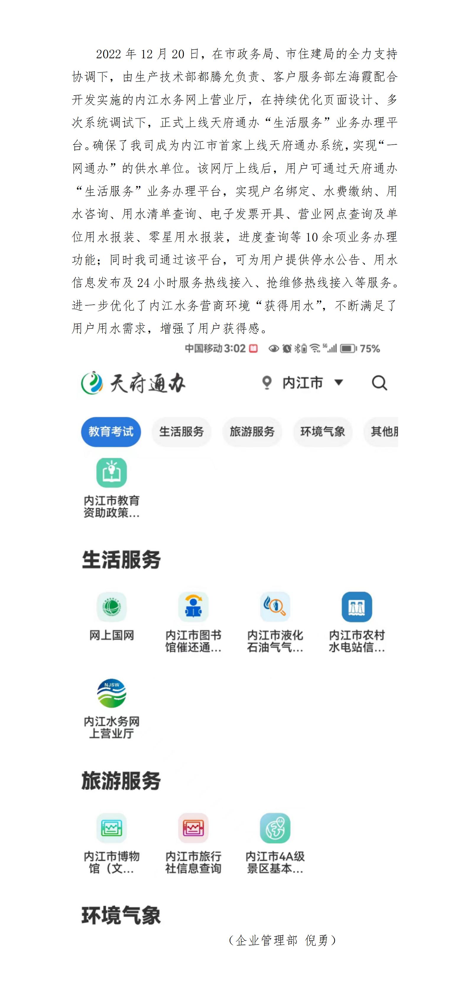 “让数据多跑路,用户少跑路” 内江水务网上营业厅正式上线天府通办平台