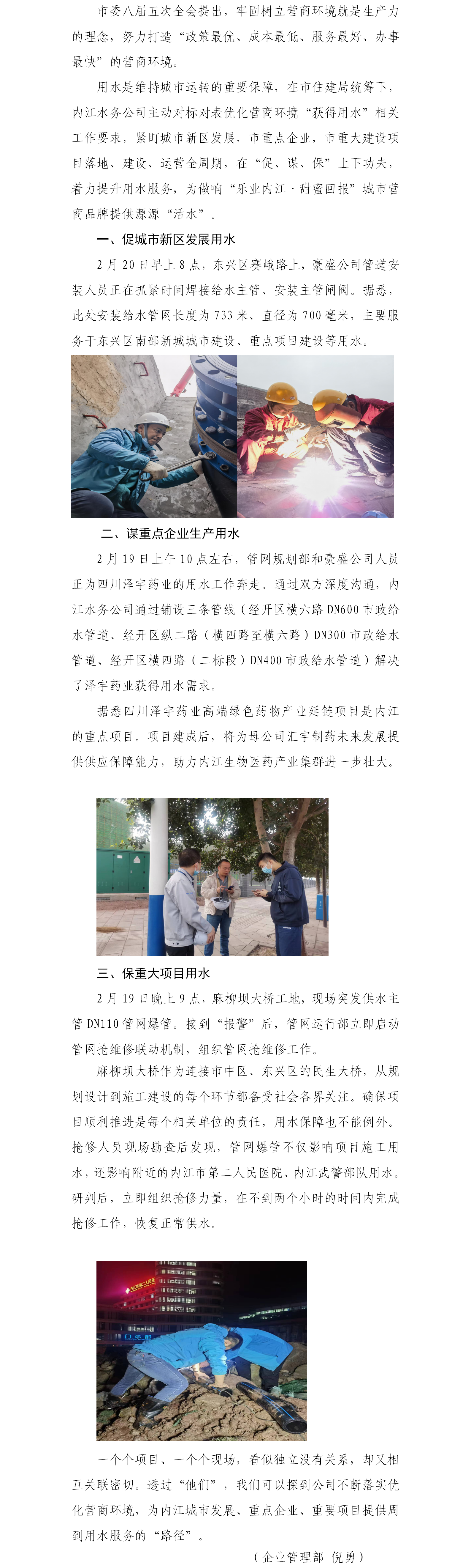 内江水务优化营商环境护航城市发展、重点企业、重大项目获得用水