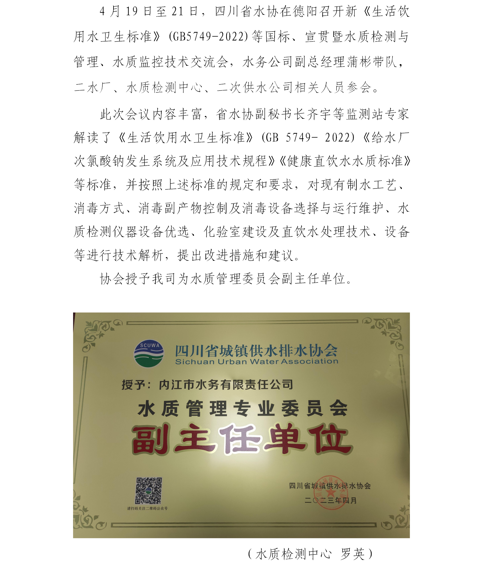内江禁漫 获省水协授予水质管理专业委员会副主任单位