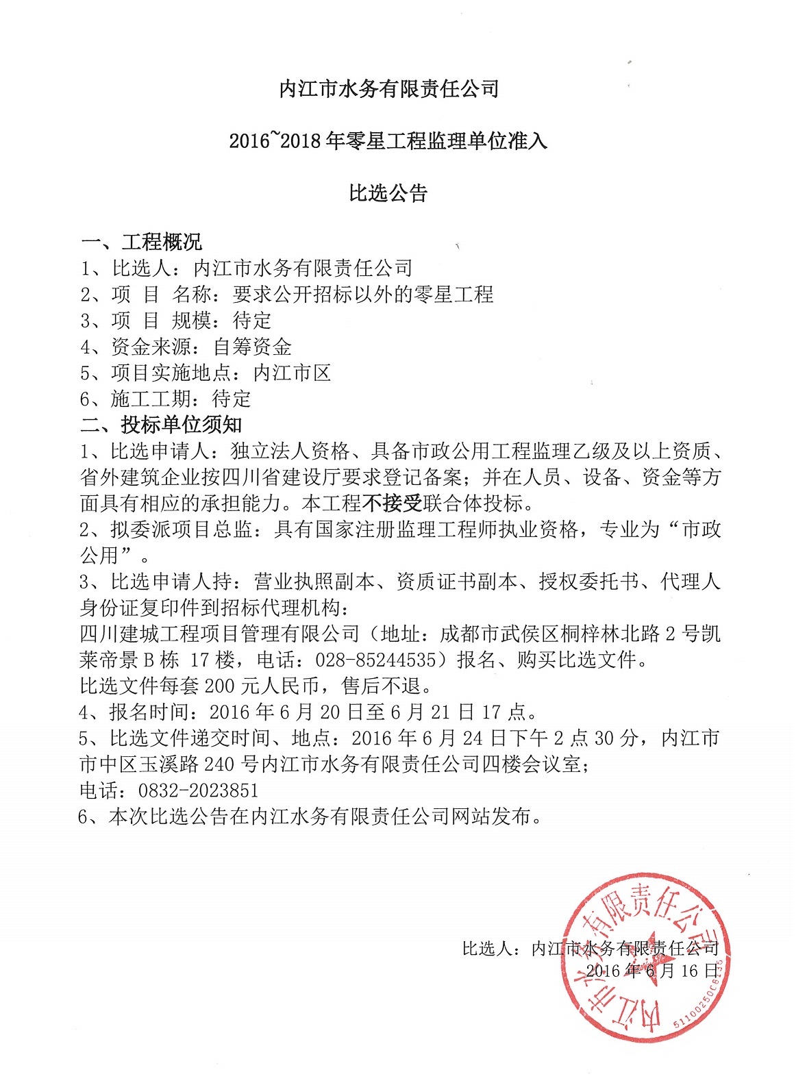 禁漫 2016~2018年零星工程监理单位准入比选公告