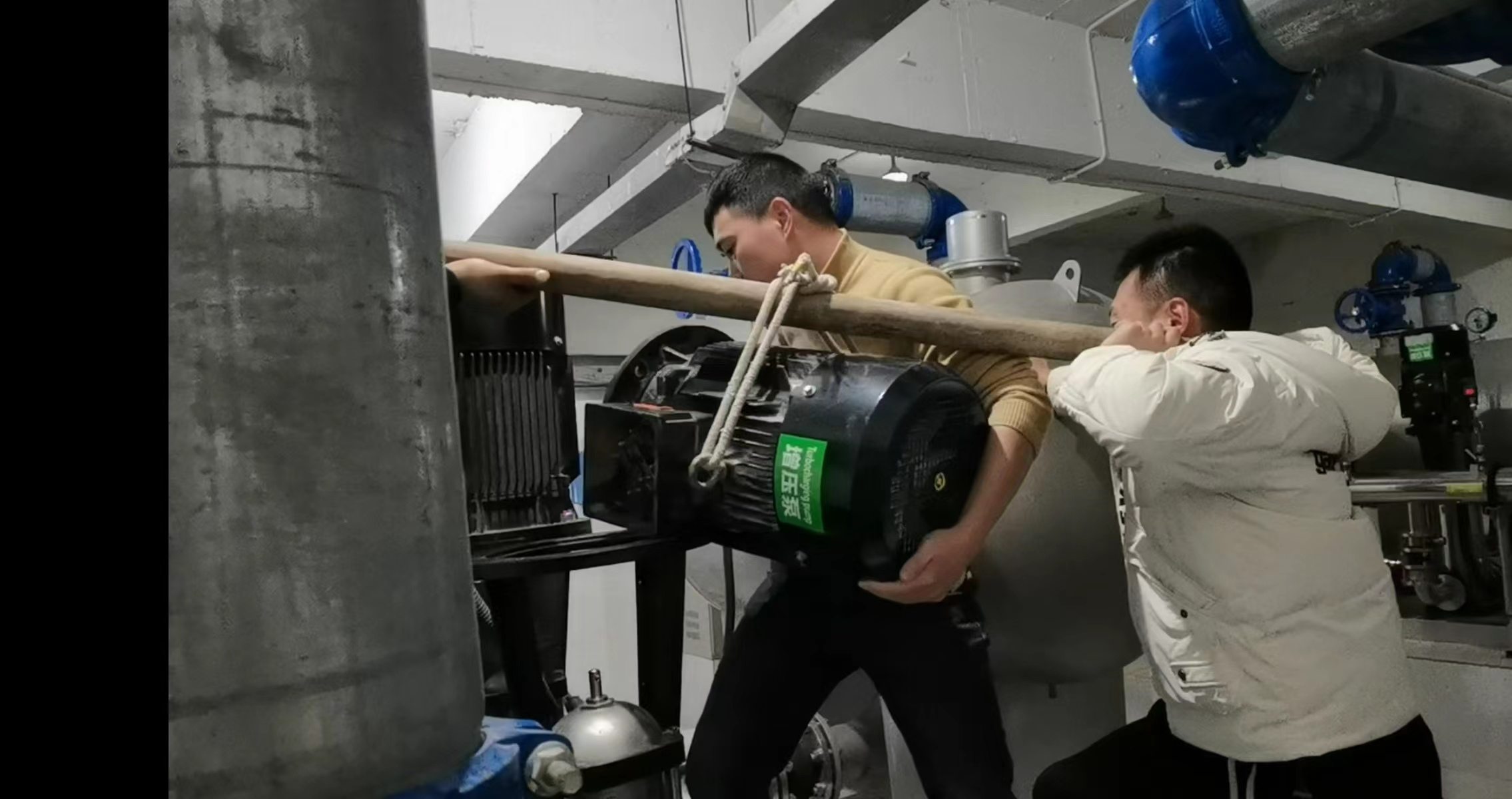 豪鹏公司加大了二次供水泵房的巡检力度,全力保障各小区的用水安全。近日,在巡检过程中巡检人员刘灵漾发现春天公园城小区的水泵运行出现声音异常,存在安全隐患,维修人员夏旭阳及时赶赴春天公园城小区泵房。经多番细致检查,发现异响声音原因来源于泵体内部的叶轮磨损导致,维修人员随即对泵体内部叶轮进行更换。夏旭阳、刘灵漾将重达300斤的增压泵抬起、归位、试机,异响消除 ,安全隐患得以解决。