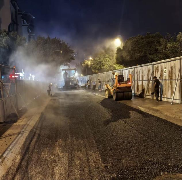 在施工收尾的关键阶段,禁漫 工程管理部与豪盛市政工程公司等部门和单位在该项目中展现了高度配合与积极协作的精神。项目团队秉持“抢工期、保质量、惠民生”的原则,克服了连续高温、夜间作业、环境复杂等多重困难。为最大限度减少对交通的影响,项目组采取了“分段围挡、错峰施工”的策略,并与交警部门协同优化临时导行方案,增设夜间警示灯、临时减速带等安全保障措施。目前,该路段路面已恢复完毕,按期恢复通行。