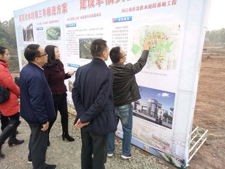 11月28日,省环境保护厅副巡视员姚东升一行到内江,对落实污水垃圾三年推进方案落实情况进行调研。调研组先后来到了桐梓坝大桥至寿溪河口综合环境整治工程、谢家河黑臭水体整治、东兴区垃圾压缩站及环卫车辆专用停车场,最后来到我司第二污水处理厂建设施工现场进行实地调研。公司党委副书记、纪委书记、工会主席李涛在《落实污水垃圾三年推进方案,建设幸福美丽内江》展板前对项目推进情况作了详细汇报,并报告了下一步工作计划。