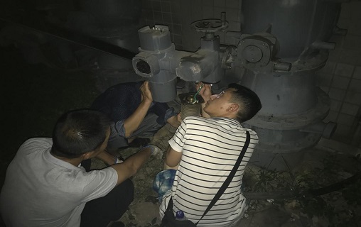 5月16日晚上19:43分,污水处理厂一期4号生化池进气阀跳闸,检修人员放弃自身休息时间,立即赶赴现场开展抢修。