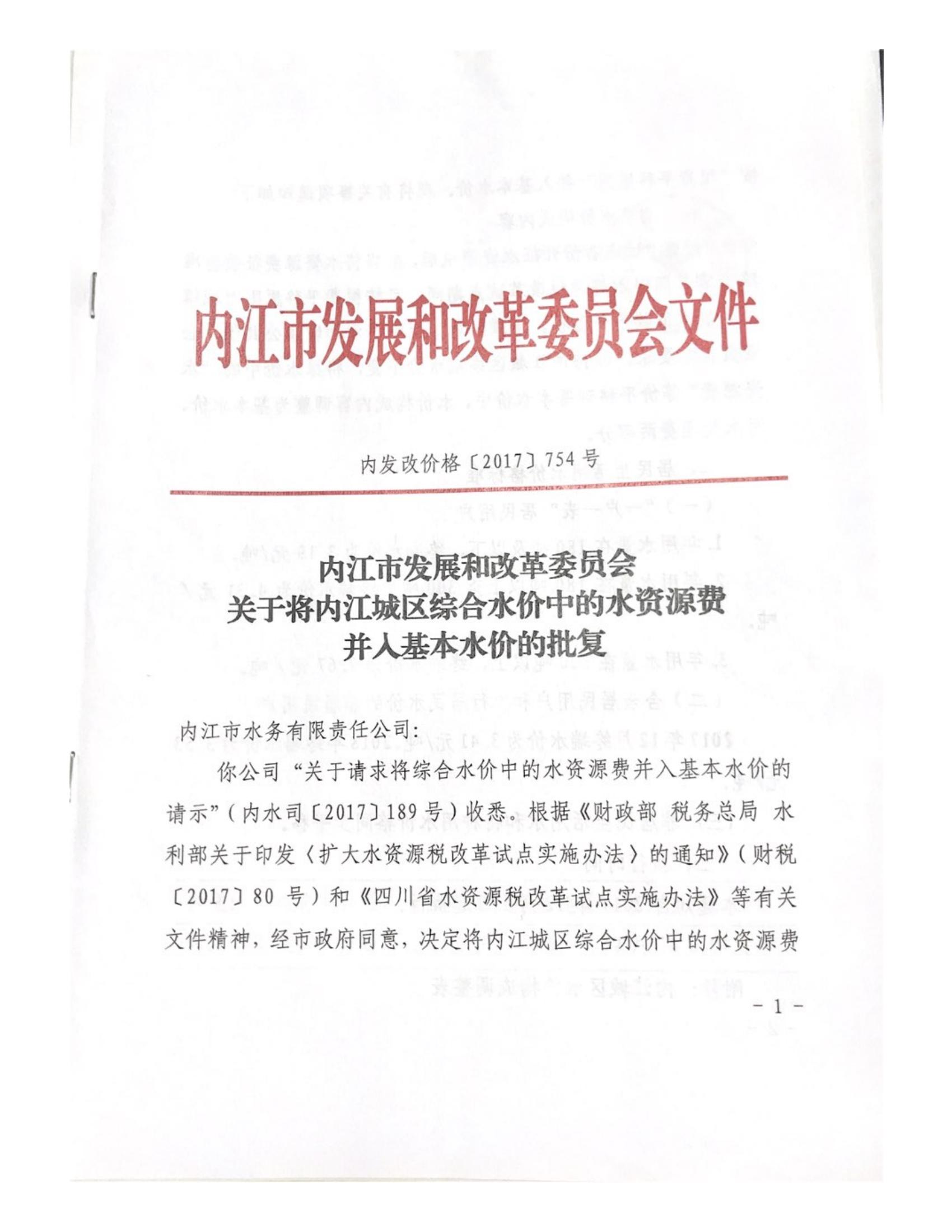 内江市发展和改革委员会关于将内江城区综合水价中的水资源费并入基本水价的批复