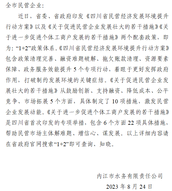 内江市“四川省民营经济‘1+2’政策”告知书